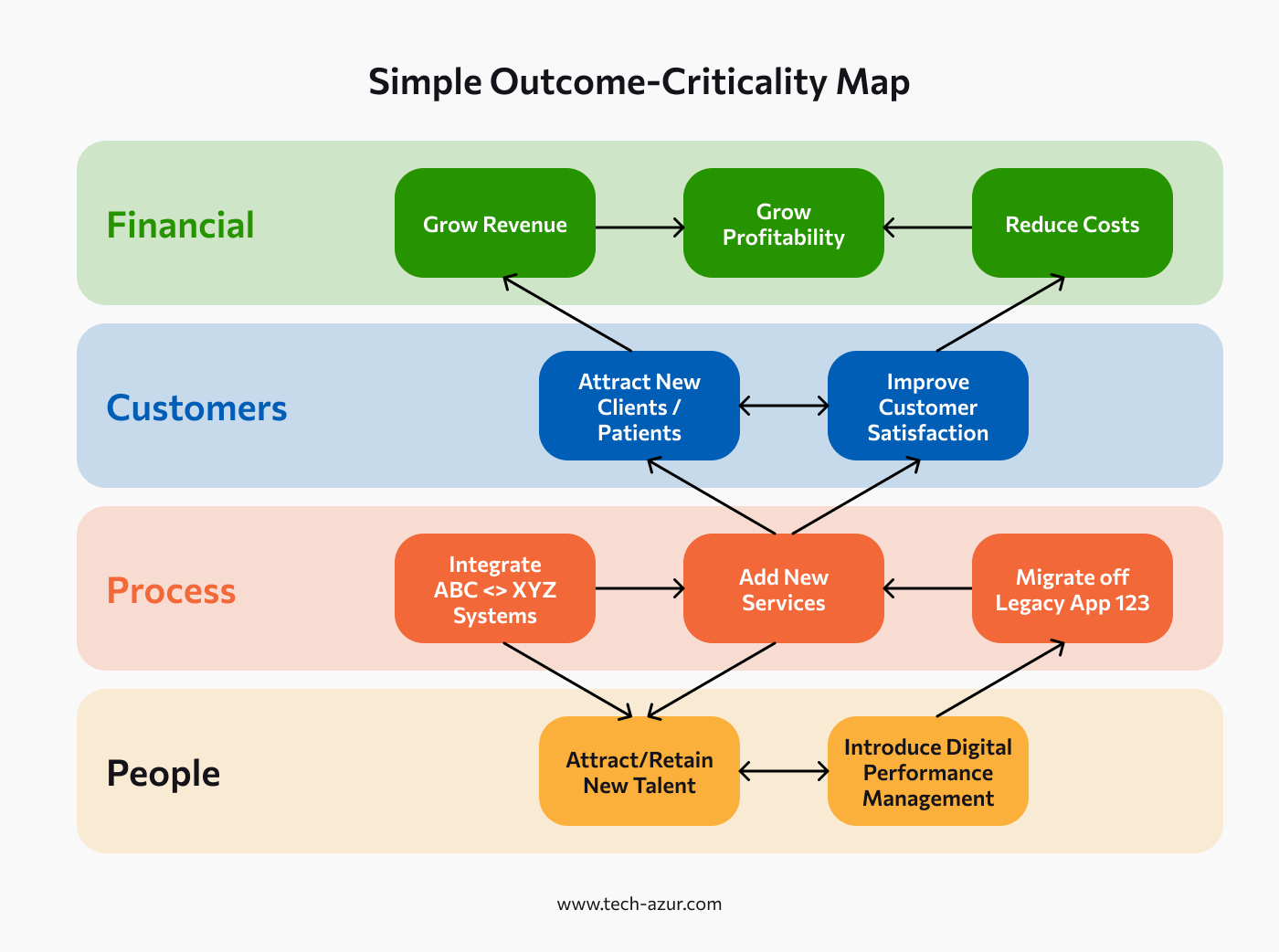 One easy tool to complicate the process of Synchronizing Your 2024 Strategy to your Digital Transformation plans involves creating a visual portrayal of the most critical outcomes being sought by Growth Strategy, and to be delivered with the help of Digital Transformation. Some would call this a ‘Strategy Map’ and there are many approaches to this. We’ve found that staying focused on ‘Criticality’ of any given outcome is actually much more effective. Here’s a very simple, generic example to ponder for a moment. Let’s see what we can learn from this view.